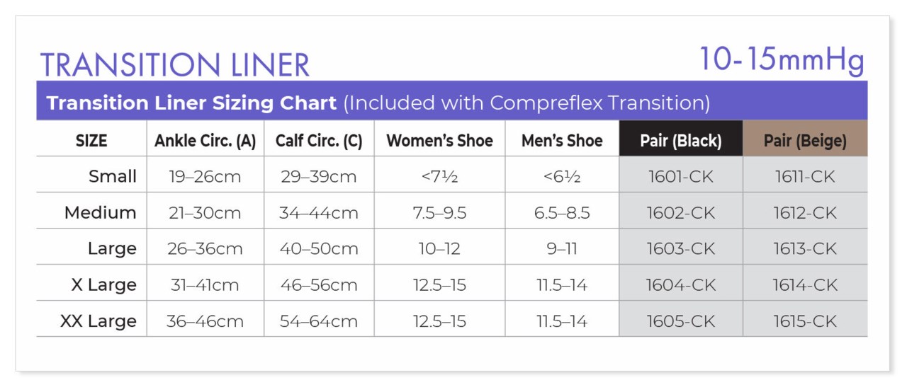 Click here to open the Sigvaris Transition liner sizing chart.