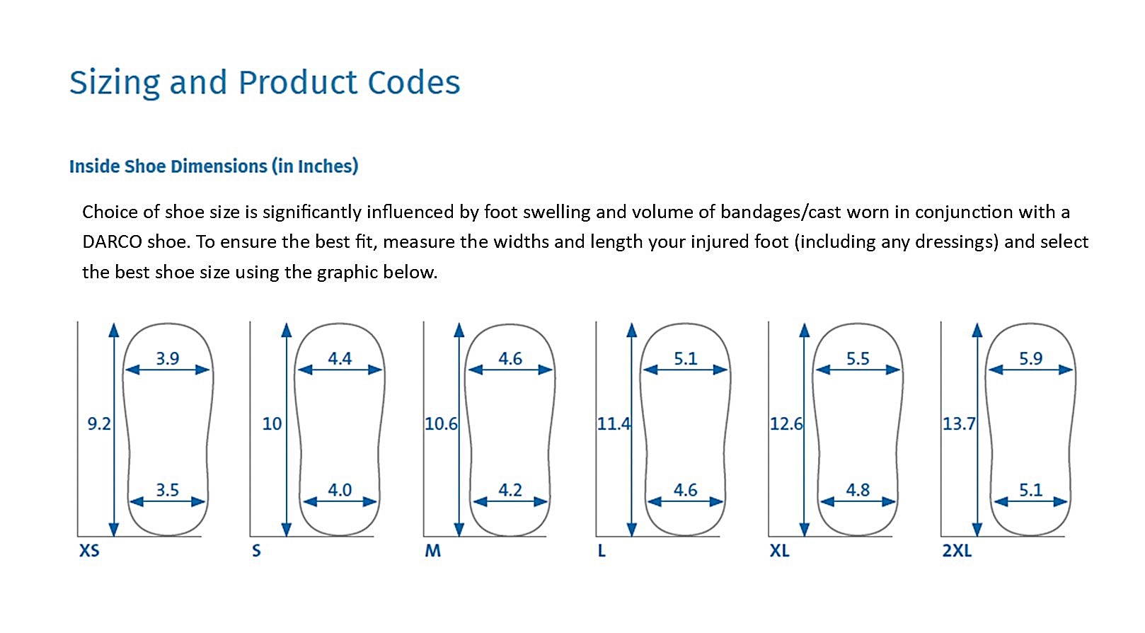 If you need assistance with sizing for Darco post-op shoes, you can call us Monday through Friday, from 9:00 am - 5:30 pm Eastern time, at (800) 770-1032, or email us any time at info@bandagesplus.com.
