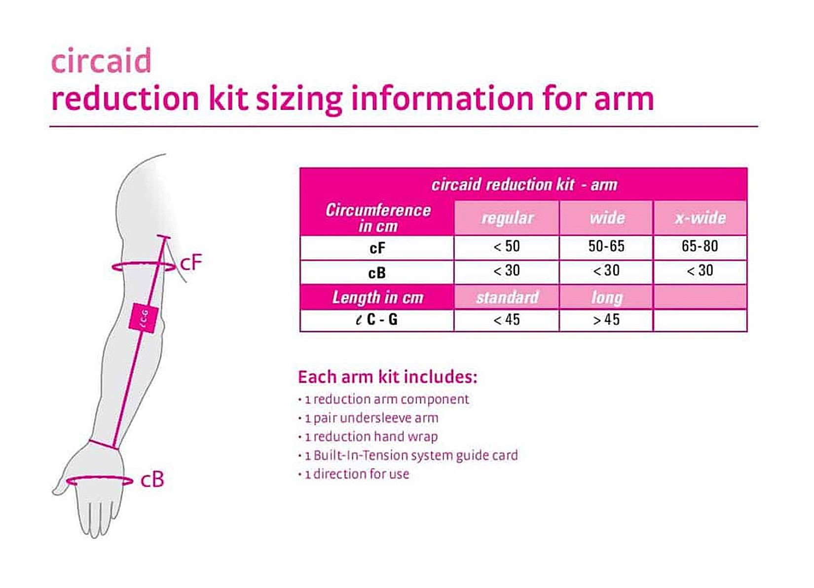 To ensure that you are ordering the correct CircAid Arm Reduction Kit lymphedema wrap, please click here to open the CircAid Reduction Kit arm compression wrap size chart.