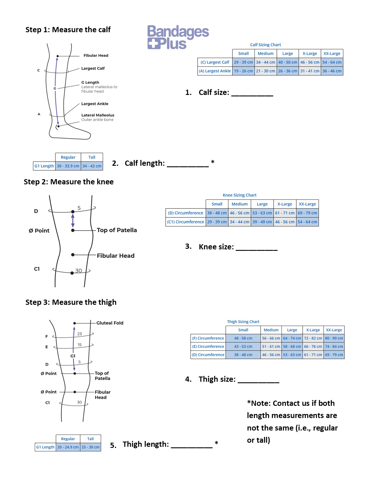 To ensure a proper fit for the Sigvaris Compreflex Contain full leg compression wraps, you will measure your calf, your knee and your thigh, as follows: