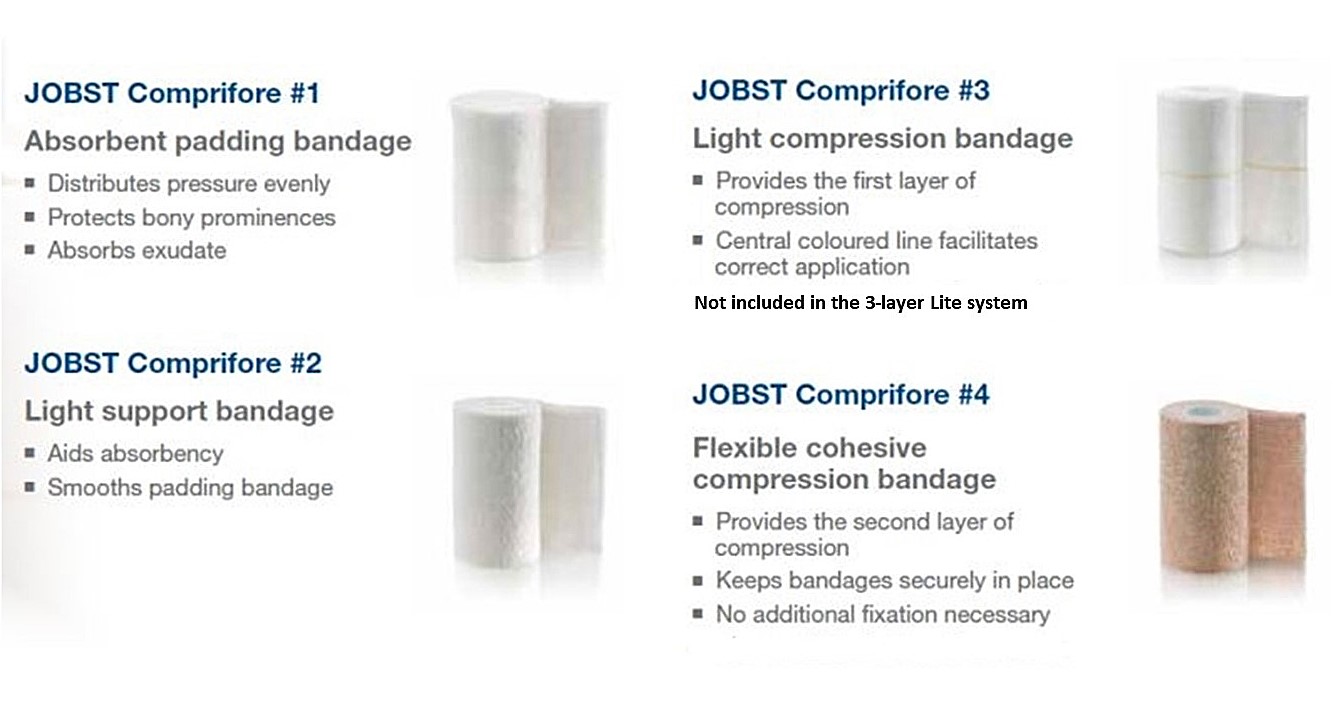 Click here to see the bandaging layer components contained in the Jobst Comprifore multiplayer compression bandaging kit.
