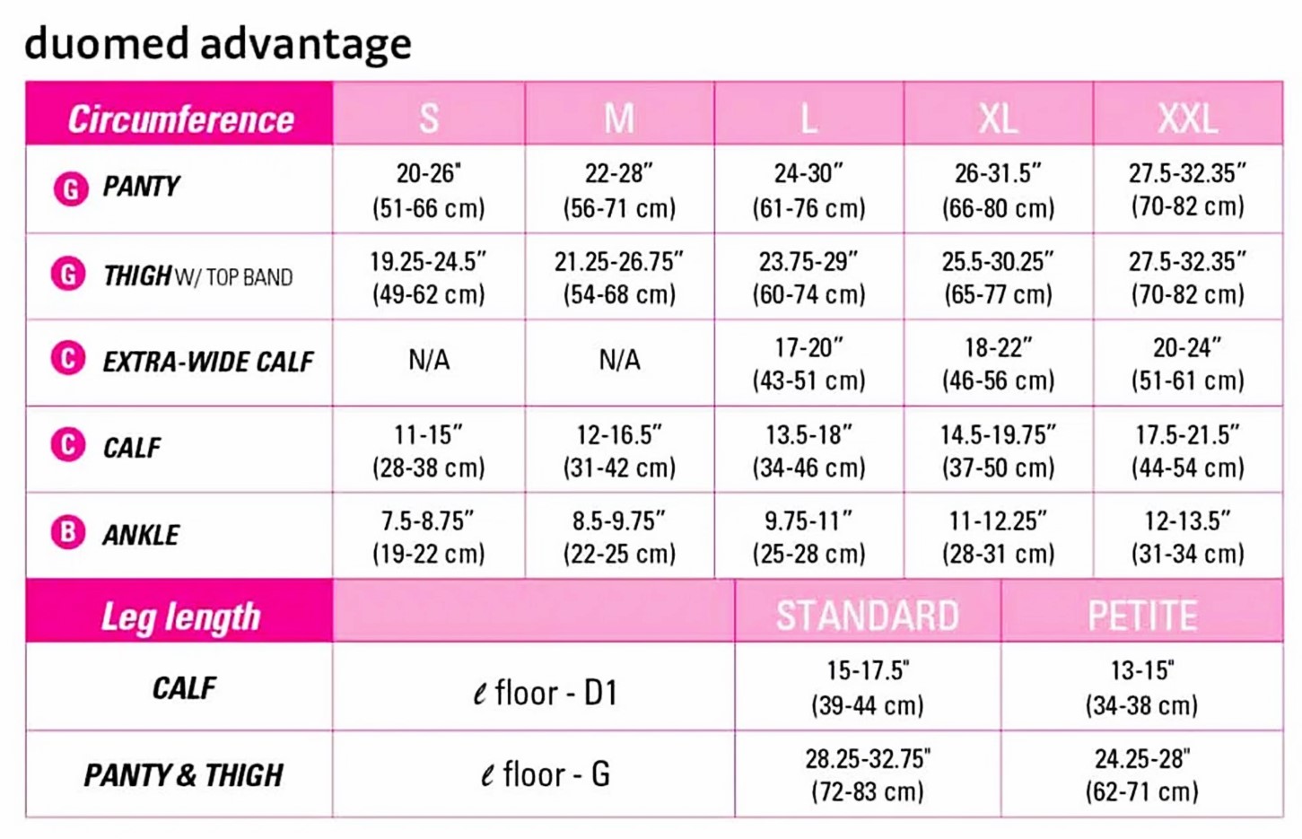 The knee high Duomed Advantage compression stockings are available in 5 different sizes, 2 calf widths (regular or extra wide calf) and 2 lengths (regular or petite):
