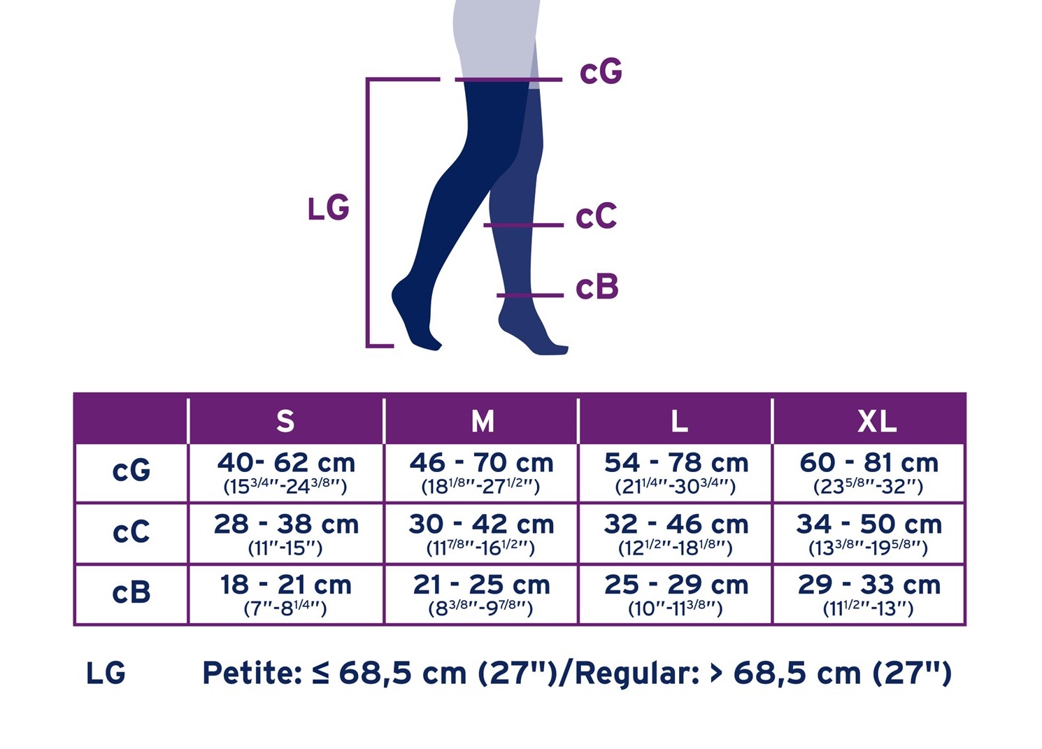The thigh high Jobst Opaque compression stockings are available in 4 different sizes: