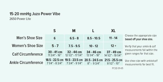 Click here to open the Juzo Power Vibe Compression Socks Sizing Chart! (Note: 15-20mm Hg compression sizing based on shoe size)