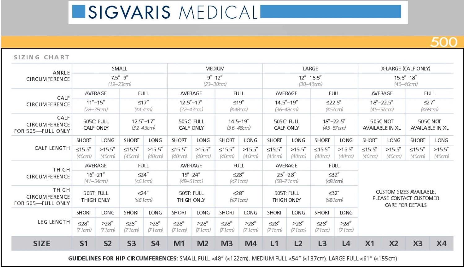 The knee high Sigvaris Natural Rubber compression stockings are available in 4 different sizes, 2 leg sizes (regular and full leg), and 2 lengths (short or long):