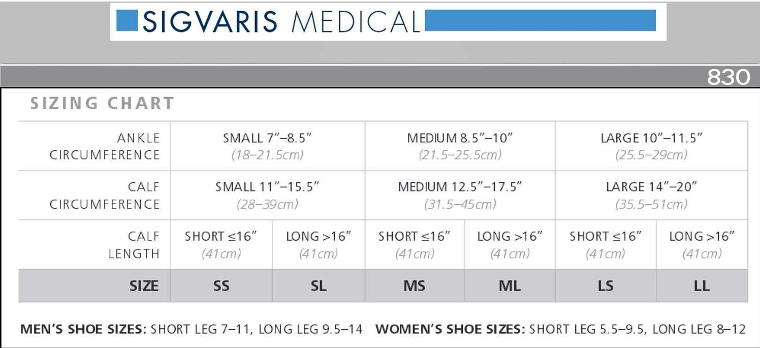 The Sigvaris Microfiber Shades compression socks are available in 3 different gender-specific sizes and 2 lengths (short or long):