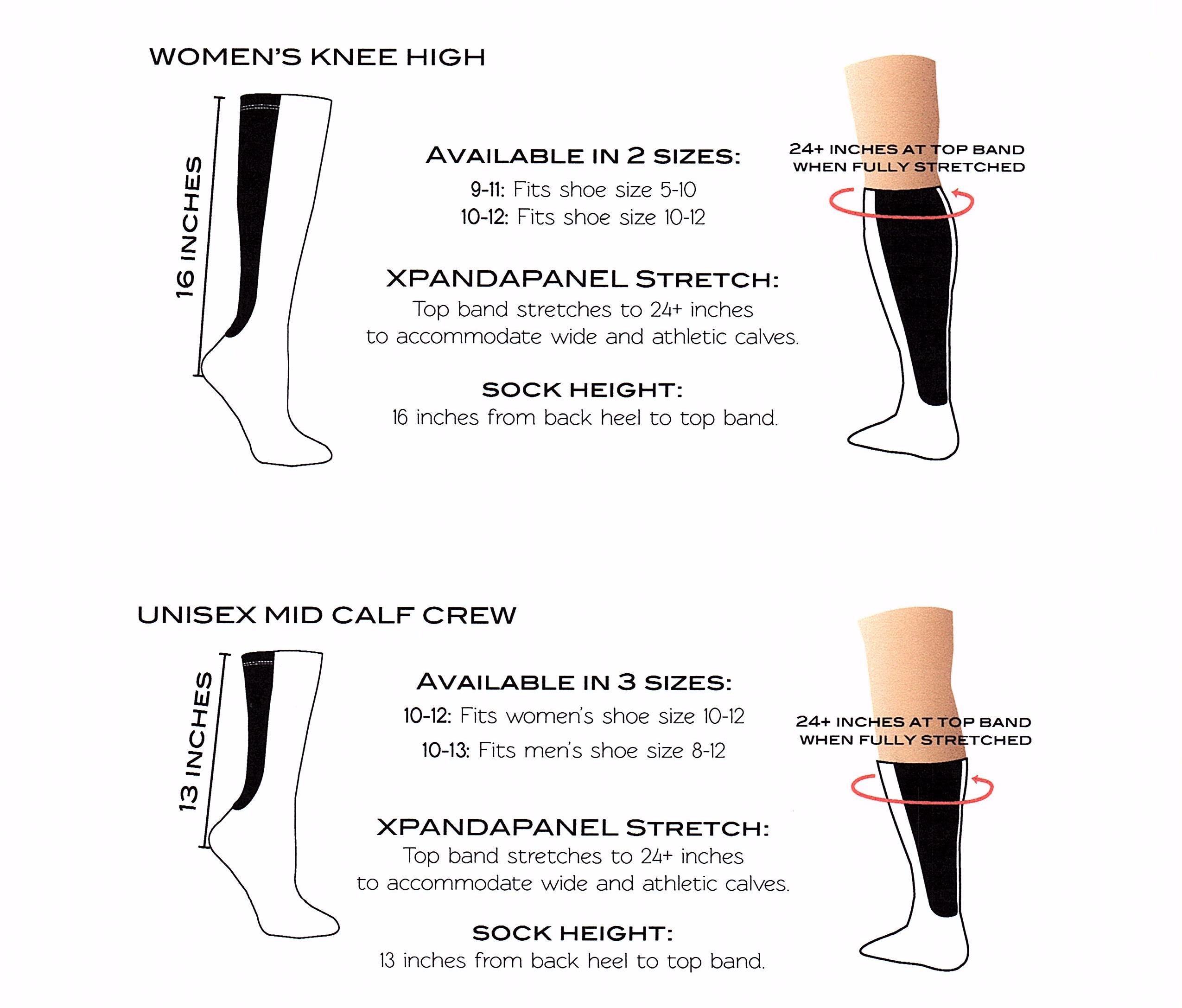 Originally conceived for plus-size, wide and athletic calves, the NEW and INNOVATIVE Xpandasox® feature a stretchy, sewn-in Xpandapanel™ that stretches over 24 inches without biding. This not only solves the common problem of finding socks with adequate stretch, but also makes Xpandasox® ideal for accommodating people with Lymphedema, Lipedema and other conditions that cause leg swelling.